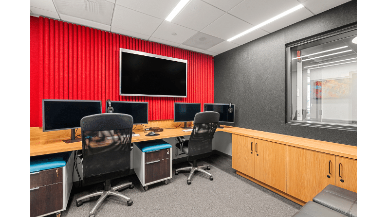 A integração inclui distribuição de vídeo HDMI via Extron NAV, roteamento SDI, áudio Dante/AES67 e rede unificada, controlados a partir de uma central conectada a interfaces sem fio da Crestron. Cada sala, dos estúdios às áreas de edição e dublagem, permite roteamento em tempo real entre os espaços, criando um fluxo flexível e eficiente para os usuários.