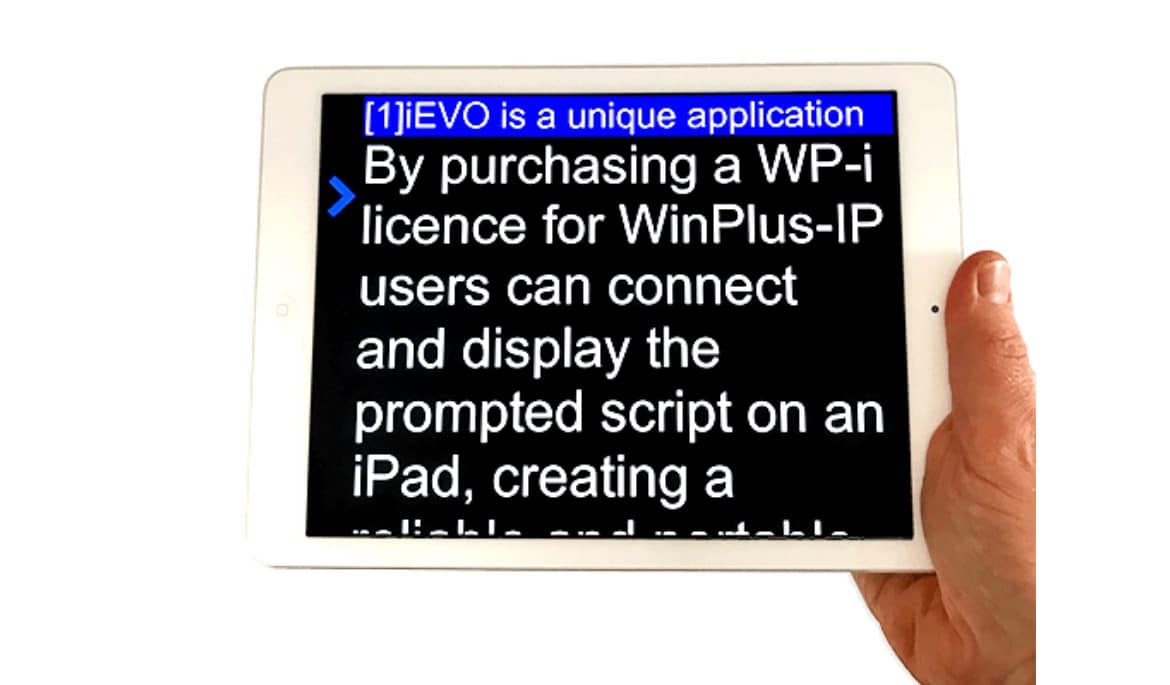 Ao adquirir uma licença WP-i para o WinPlus-IP, os usuários podem se conectar e exibir um script solicitado em um iPad para fornecer um monitor confiável e portátil para operadores e talentos. Quando conectado ao WinPlus-IP, a solução de alerta totalmente habilitada para IP da Autoscript, um iPad com o aplicativo iEVO será exibido como um dispositivo padrão no gerenciador de dispositivos. Uma vez selecionado em uma versão licenciada do software, este iPad recebe os dados de aviso do WinPlus-IP sobre Wi-Fi ou adaptador Ethernet com fio, permitindo que o script seja renderizado para que o dispositivo se torne um monitor adicional.