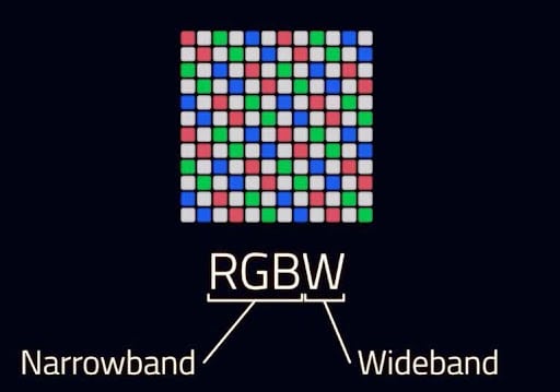 Chamaremos os fotossítios R, G e B de banda estreita. Isso ocorre porque o filtro posicionado à sua frente permite que apenas um espectro limitado de luz colorida atinja o fotossítio. Já os fotossítios brancos serão chamados de banda larga, pois, por não possuírem um filtro colorido, recebem um espectro de luz muito mais amplo.