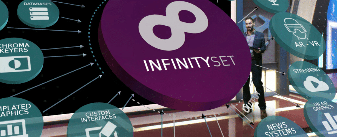 O InfinitySet trabalha ao máximo em ambientes complexos de transmissão, funcionando como um centro para uma série de tecnologias e hardware necessários para a operação de cenários virtuais e realidade aumentada, como keyers de hardware croma, dispositivos de rastreamento, câmeras, mixers e outros. Além disso, transcende os limites da transmissão em tempo real ao entrar no mercado de séries e filmes, tornando-se o padrão para a produção virtual fotorrealista em tempo real e a visualização de conteúdo de alta qualidade. Por último, mas não menos importante, o InfinitySet demonstrará um novo módulo para melhorar as apresentações, criando conteúdo avançado de RA usando material de qualquer ferramenta de apresentação, como Microsoft PowerPoint ou Adobe PDF.