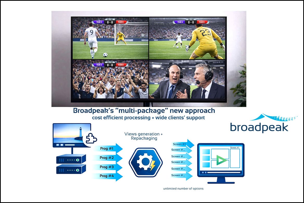 A solução da Broadpeak adota um modelo de multipacotes que combina feeds de vídeo no nível do packager, após a etapa de codificação. Dessa forma, reduz-se a necessidade de processamento no encoder. O processamento ocorre na rede e apenas um stream final é entregue ao usuário. Com isso, os dispositivos finais não precisam de capacidades específicas de player ou poder adicional de processamento para suportar a experiência.