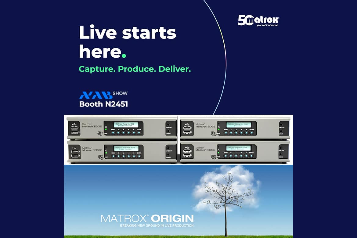 Além do ORIGIN, a Matrox Video apresentará soluções IP voltadas à produção ao vivo que abrangem desde captura até distribuição. Entre os equipamentos demonstrados estão o Matrox Monarch EDGE, voltado a codificação e decodificação de baixa latência para produção remota; o Matrox ConvertIP, projetado para integração entre fluxos SDI e ST 2110 ou IPMX; e o Matrox Vion, gateway multicanal 4K que permite codificação, decodificação, transcodificação e conversões entre diferentes formatos em ambientes de produção ao vivo e em nuvem.