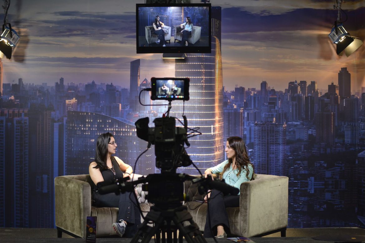 No estande da empresa, o visitante encontra o um estúdio de gravação, uma sala de switcher e uma unidade móvel